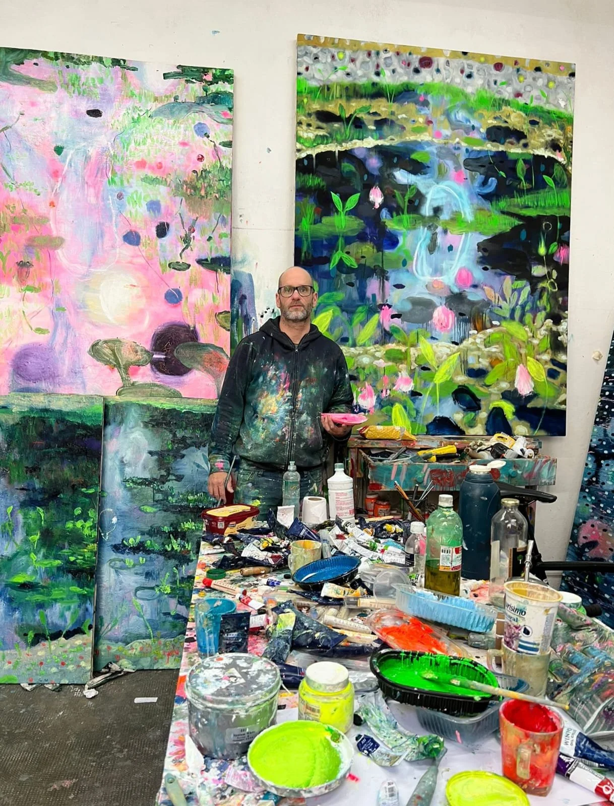 His work, deeply connected to nature as a source of refuge and inspiration, has evolved from portraits in vividly colored landscapes to large-scale compositions where the environment takes center stage. His experiences in the Amazon rainforest marked a turning point in his practice, leading to a poetic and critical exploration of landscape: from the environmental disaster of Bento Rodrigues (Brazil, 2016) to New York’s Central Park, the Queguay hills in Paysandú, and the Atlantic forest in Minas Gerais.